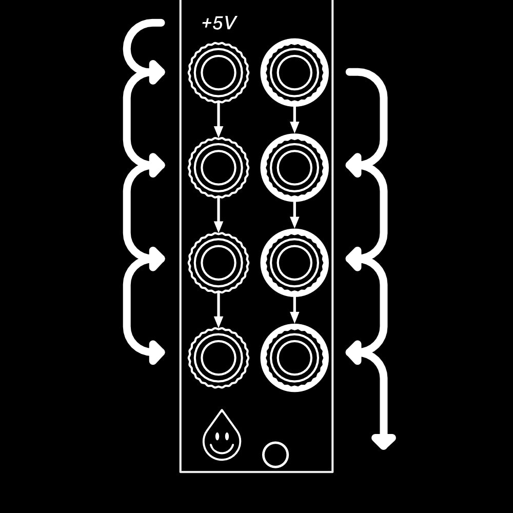 If no cable is connected to an input, that input receives a copy of the input above it. If no cable is plugged into the first input it receives +5V allowing some or all of junctions channels to be used as DC voltage sources. If no cable is connected to an output, it mixes with the output below at unity gain.